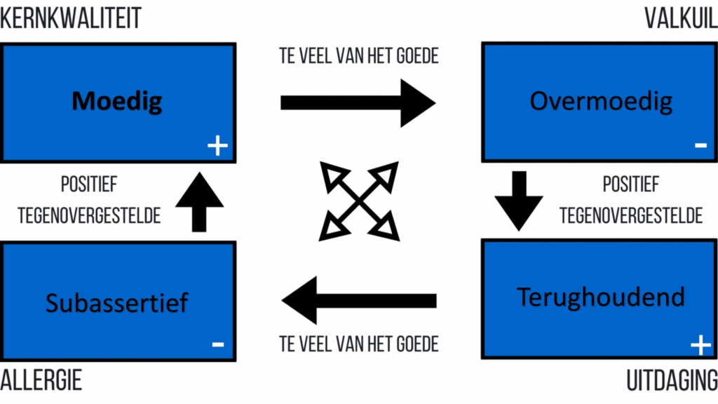 Het concept en de definities zijn geïnspireerd op het VIA character Strengths model. Hieronder zie je bovenstaande woorden verwerkt in het kernkwadranten model. De valkuilen, uitdagingen en allergiën die passen bij de kernkwaliteit verschillen per persoon. Neem het model zoals het hierboven staat dan ook als inspiratie, maar denk ook na hoe dit bij jou is.