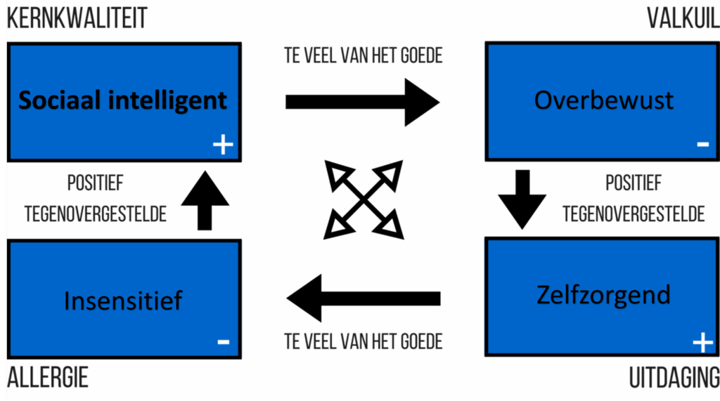 Het concept en de definities zijn geïnspireerd op het VIA character Strengths model. Hieronder zie je bovenstaande woorden verwerkt in het kernkwadranten model. De valkuilen, uitdagingen en allergiën die passen bij de kernkwaliteit verschillen per persoon. Neem het model zoals het hierboven staat dan ook als inspiratie, maar denk ook na hoe dit bij jou is.