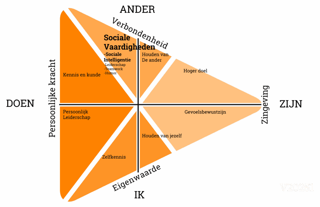 In ons ontwikkelmodel zien we sociale intelligentie als onderdeel van ‘sociale vaardigheden’ naast leiderschap, teamwork en humor.