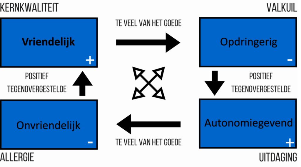 Het concept en de definities zijn geïnspireerd op het VIA character Strengths model. Hieronder zie je bovenstaande woorden verwerkt in het kernkwadranten model. De valkuilen, uitdagingen en allergiën die passen bij de kernkwaliteit verschillen per persoon. Neem het model zoals het hierboven staat dan ook als inspiratie, maar denk ook na hoe dit bij jou is.